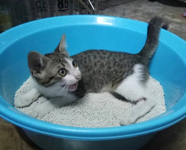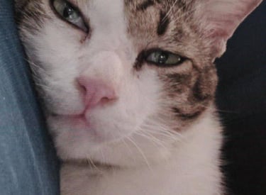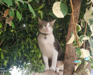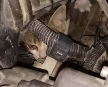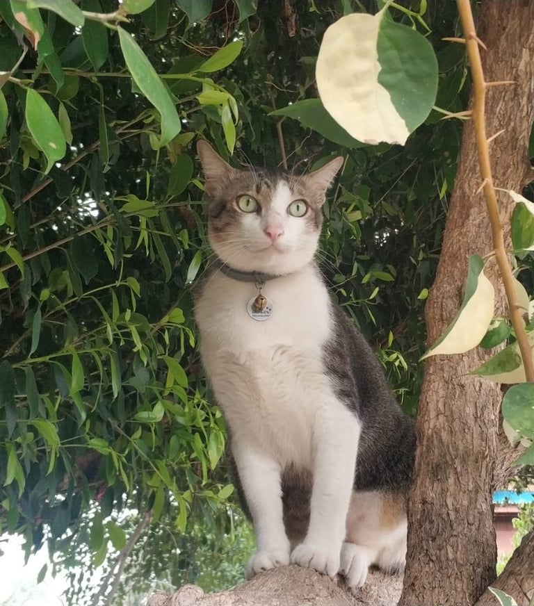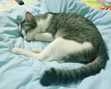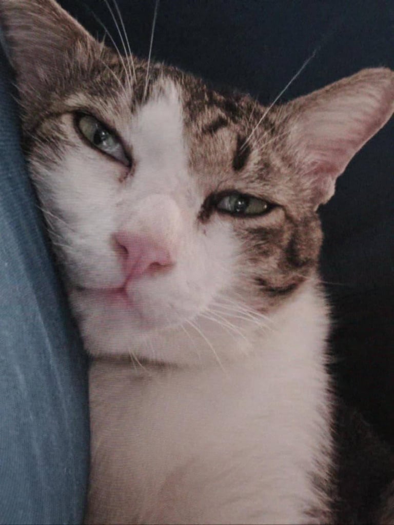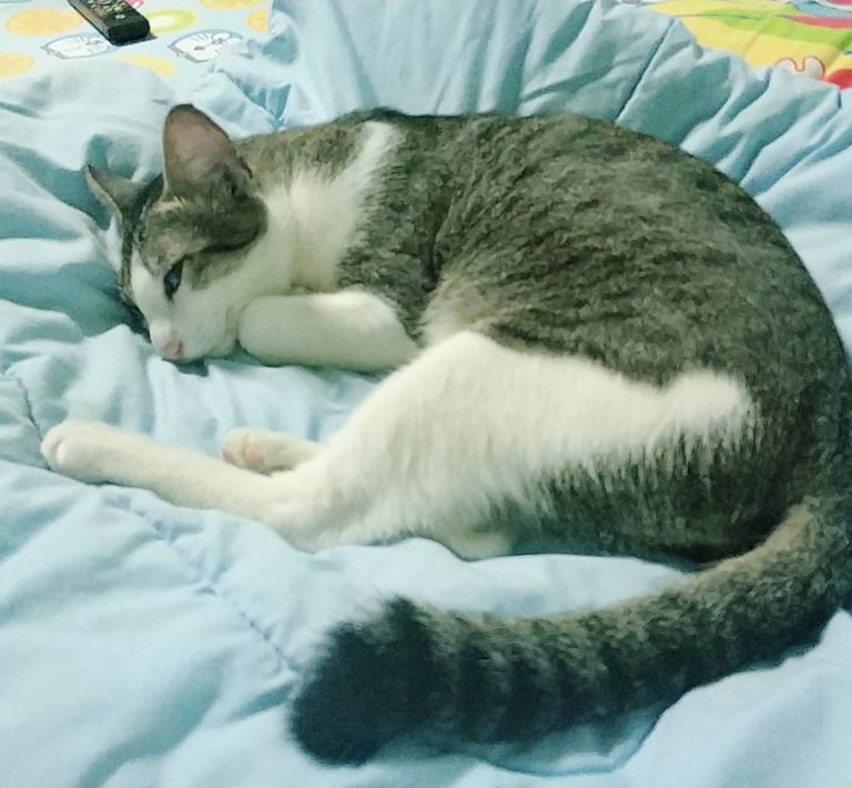 พี่เสือแอบอยู่ในห้องเครื่องของรถ..เราเองก็ไม่รู้ว่าพี่เสือมาจากไหน ตอนเจอกันพี่เสือมีแผลที่ขา นับถึงวันนี้ก็ 8 ปีแล้วที่อยู่ด้วยกัน ตอนนี้ทำหมันแล้ว ออกจะชอบเที่ยว มีซนบ้างแต่ก็ไม่มาก..ขี้อ้อนมากกว่า โดยเฉพาะตอนหิว..ชอบให้เอาหัวไปชนกับเขานะ..กินเก่ง และก็กลัวเสียงฟ้าร้อง